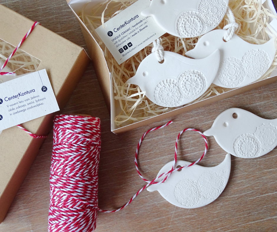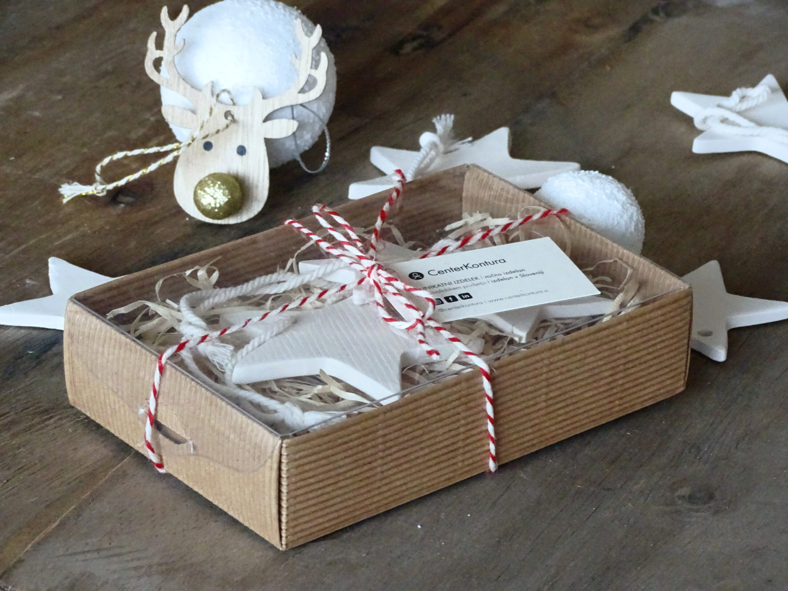 Za prihajajoče praznike smo v Centerkonturi pripravili novoletni poslovni darilni komplet treh glinenih okraskov z motivom zvezdice ali ptička. Okraski so primerni za okraševanje pisarn, poslovnih prostorov ali kot darilo za vaše poslovne partnerje in sodelavce. Naša novoletna poslovna darila so primerna za vse, ki cenijo ročno delo in trajnostne materiale. Glineni okraski niso namenjeni zgolj dekoraciji, temveč nosijo tudi globlje sporočilo solidarnosti in podpore pri zaposlovanju invalidov.