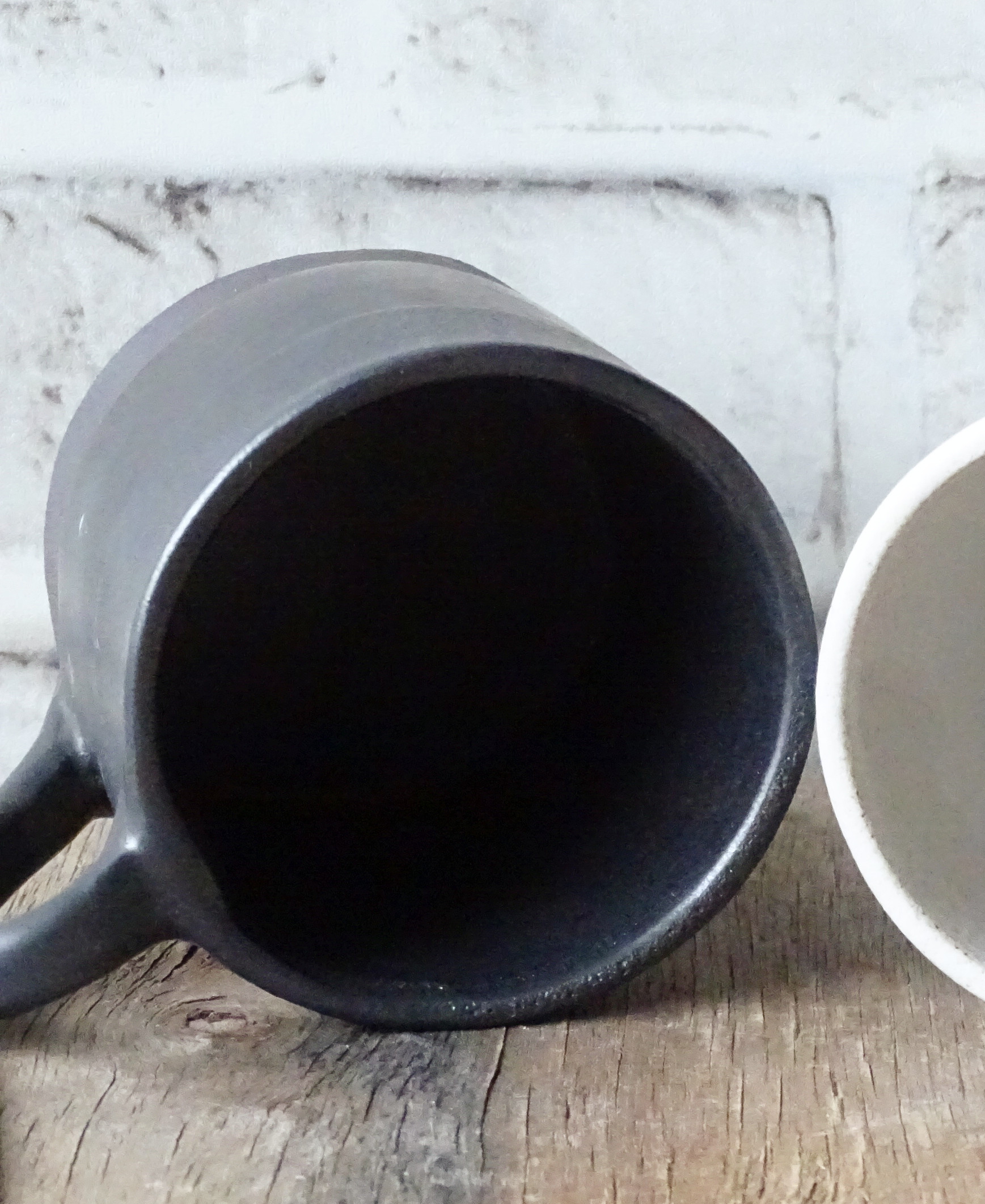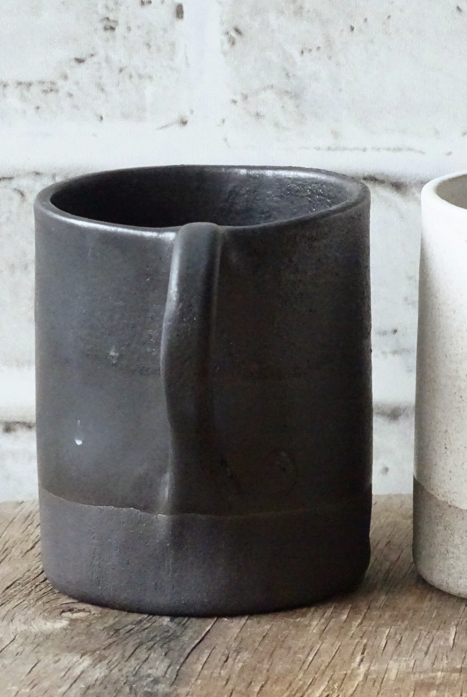 Prikupna minimalistična glinena skodelica (črna) z ročajem, ravno pravšnja za kavo ali čaj je ročno izdelana iz visokokakovostne gline, ki je naravni material, sestavljen iz delcev mineralov, peska, ilovice in drugih komponent. Skodelica ima glazirano notranjost in delno zunanjost. Glinena skodelica je primerna za pitje toplih in hladnih napitkov, kadar pa ni v tovrstni rabi, lahko služi kot domiselna vazica za šopek svežega cvetja.