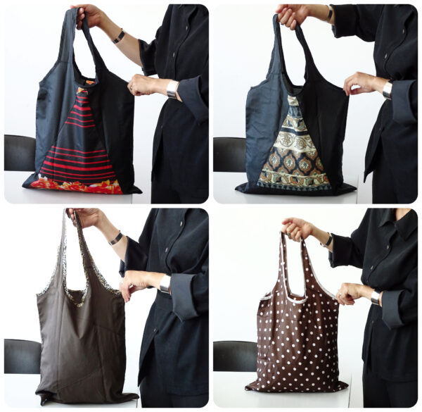 Nekatere nosilne vrečke se zložijo v okroglo obliko z motivom cveta, ročno narejenega iz usnja, druge vrečke se zgolj zvijejo v zvitek iz filca.