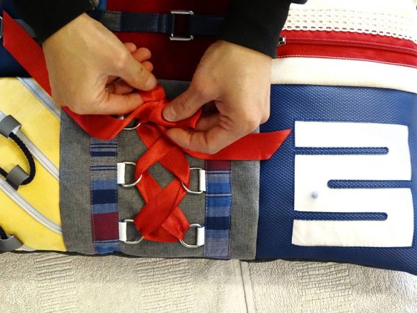 Rehabilitacijska blazina je namenjena starostnikom in drugim osebam, ki so utrpele možganske okvare. Je prijetno rehabilitacijsko orodje in z njeno uporabo vadimo spretnosti, ki se navezujejo na finomotorično aktivnost v rokah, vplivamo na kognitivne spretnosti in taktilno stimulacijo ter vzpodbujamo sproščeno razpoloženje pri uporabniku. Rehabilitacijska blazina je narejena iz prijetnih materialov sintetično polnilo zagotavlja, da je blazina lahka in ne obremenjuje naročja.